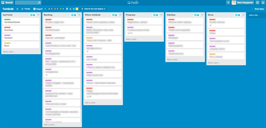Trello – Trello on toiminut hyvänä työkaluna luomaan isoa kuvaa ja ohjaamaan viikkotekemistä. Nimitän toimintamalliani köyhän miehen Kanbaniksi, jossa noudatan Kanbanista mukailtuja oppeja viikkotasolla. Käytännössä toimin näin ymmärtääkseni paremmin asioita joita pitää tehdä, kuin myös taaksepäin suoritettuja tehtäviäni.