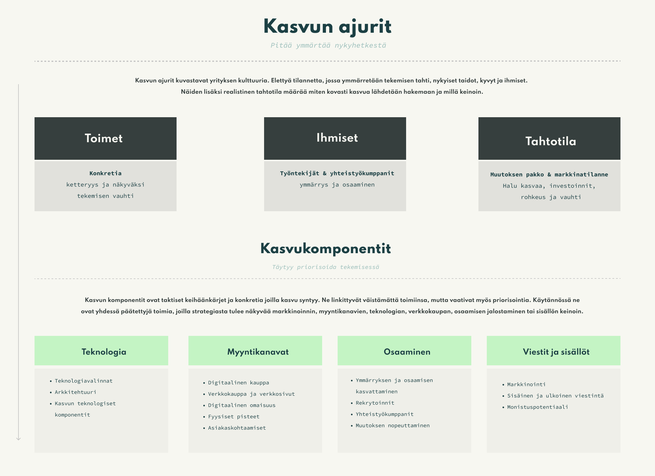 Kiteyttääkseen Kasvun tiekarttaa, kiinnittyy se kaikista lähimmäksi yrityksen digitaalista kasvustrategiaa, jonka keskiössä on muutoshalu.
