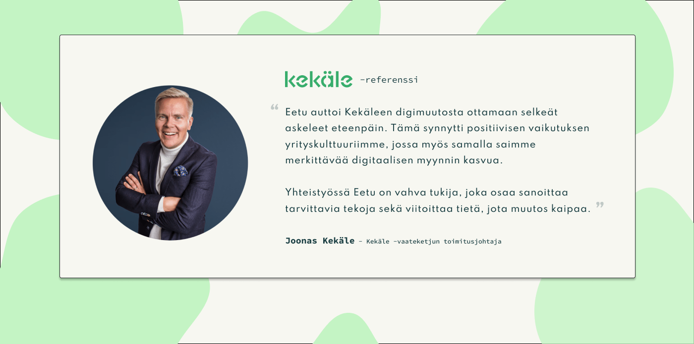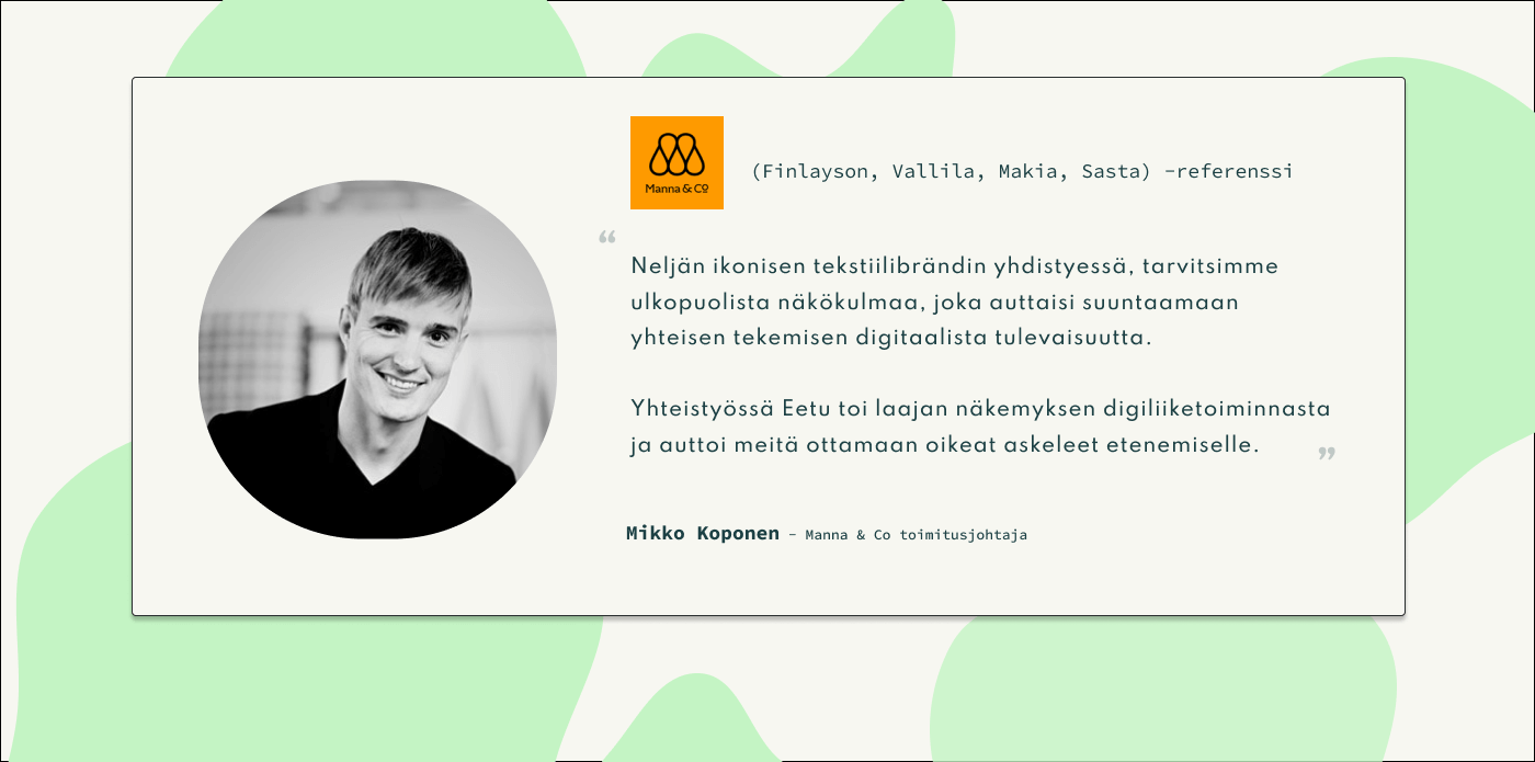 Omistajastrategian alle on jalostunut yrityksen strategia, jossa hamutaan kasvua. Ja erityisesti, jos kasvustrategiaa suunnitellaan, tai sen keskiössä on missään määrin digitaalisuus, markkinointi tai verkkokauppa, kannattaa meidän jutella.