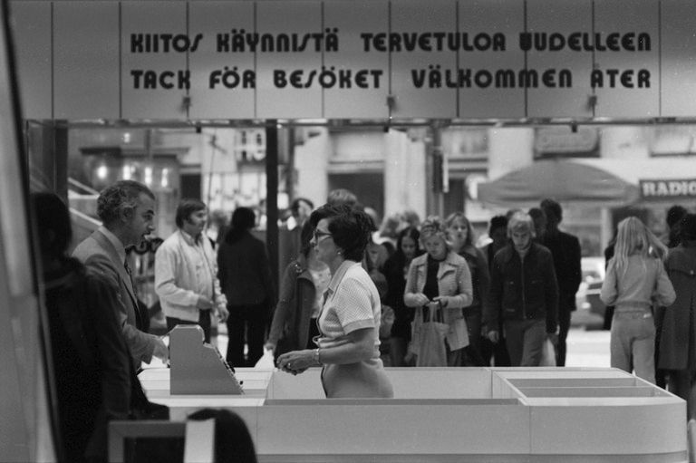 Artikkelikuva: Valokuvaaja: Rista Simo / Kaisaniemenkatu 5. Pukevan uudistunut tavaratalo laajennusosan valmistuttua, 1973.
